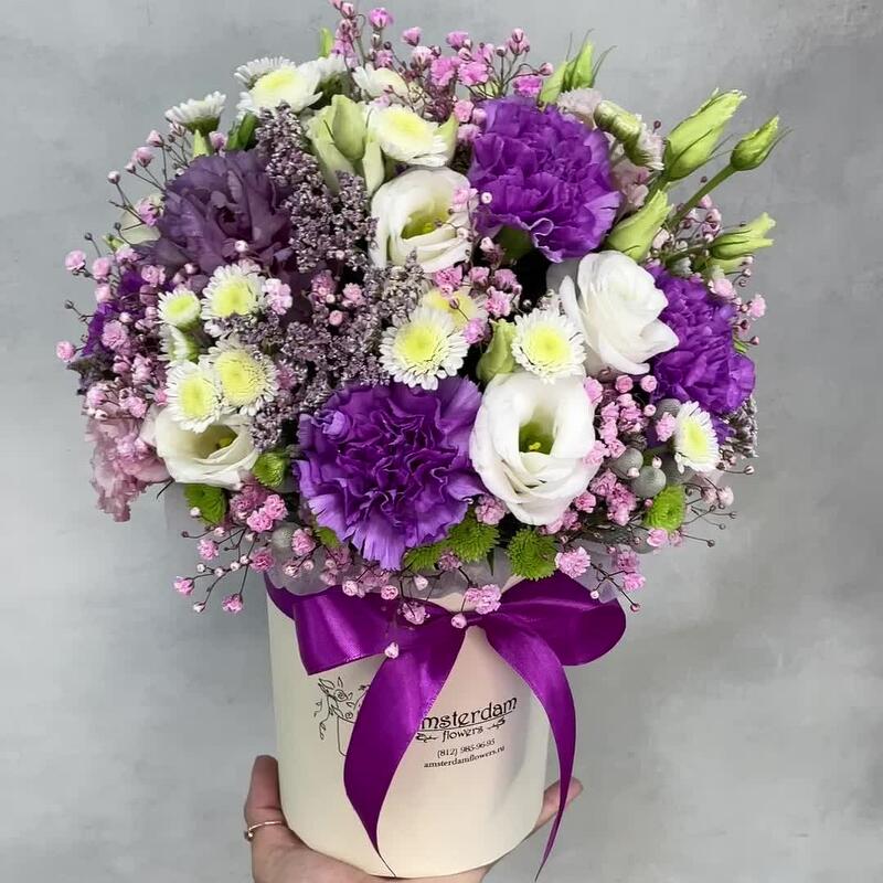 Потрясающий букет с лунной гвоздикой в оригинальной шляпной коробочке, он очень стойкий и ароматный, цветы премиум качества! Этот букет украсит любой интерьер. Идеален в качестве презента любимой маме, девушке, супруге.