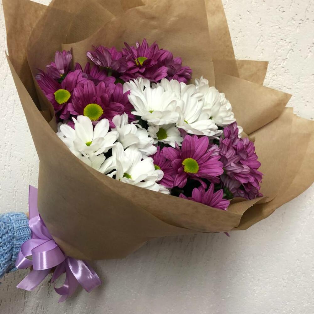 5 веток белой и розовой кустовой хризантемы в крафтовой бумаге
