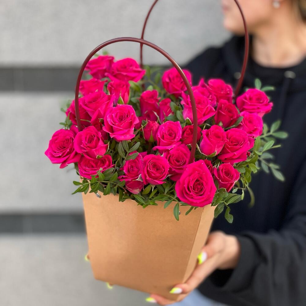 Этот элегантный букет представляет собой сочетание красивых кустовых роз, нежно-зеленой фисташки и оазиса в упаковке в виде стильной сумочки. Благодаря удобной упаковке букет легко поддерживает свою свежесть и останется красивым долгое время. Он станет прекрасным подарком для любого случая и порадует своего получателя своей красотой и неповторимым ароматом.