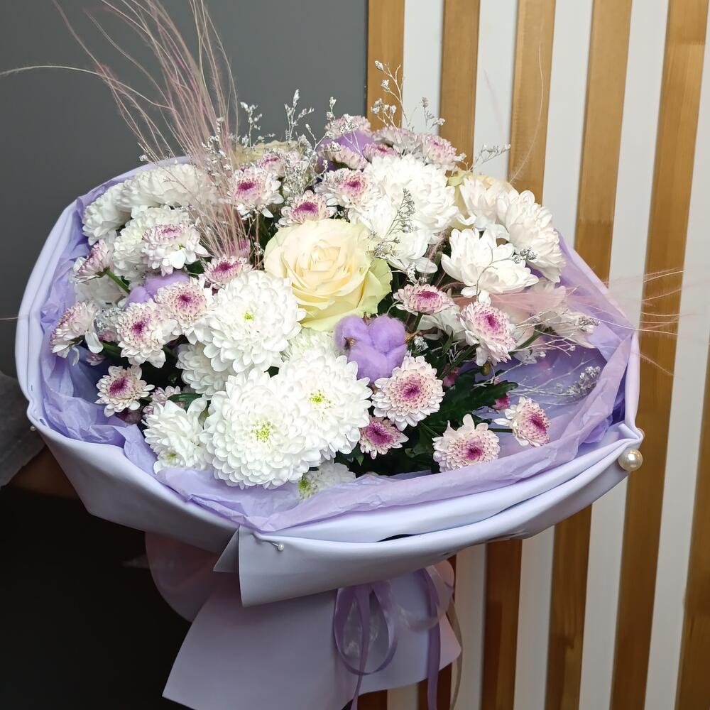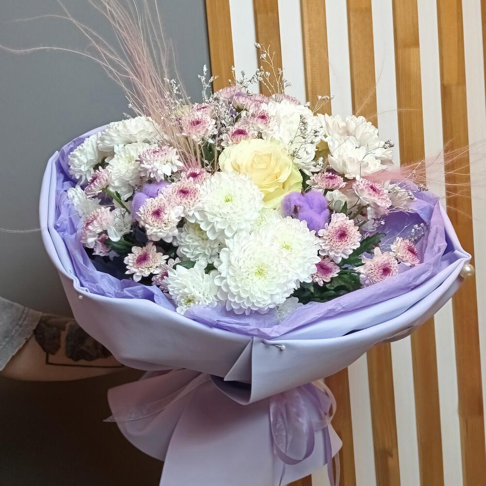 Пышный букет из микса хризантем и роз. Идеальный подарок для мамы на 8 марта .