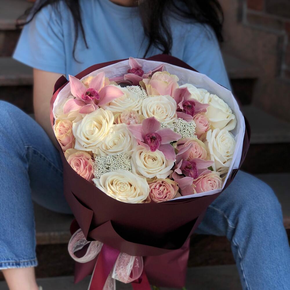 Букет «Диадема» из голландских роз и орхидей в Дмитриеве