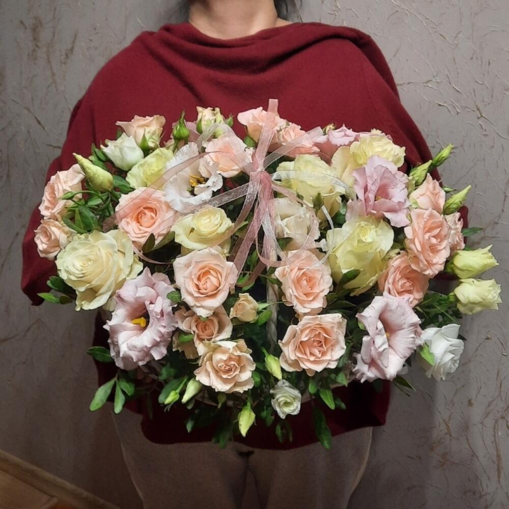 Роза кустовая - 9 шт. Роза - 9 шт. Эустома - 9 шт. Корзина плетеная - 1 шт. Оазис флористический - 1 шт.