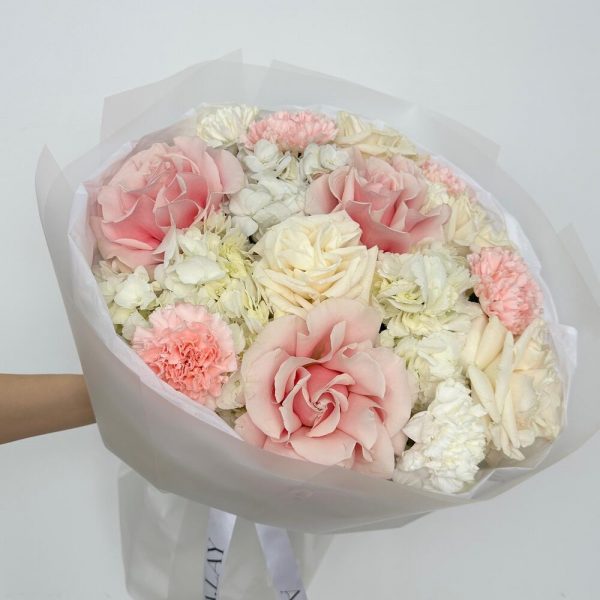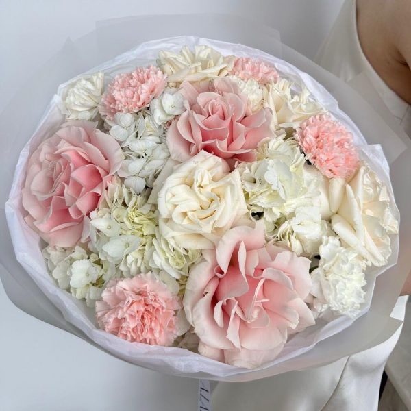 Круглый объемный букет из Роз Диантусов и Гортензии в Дмитриеве