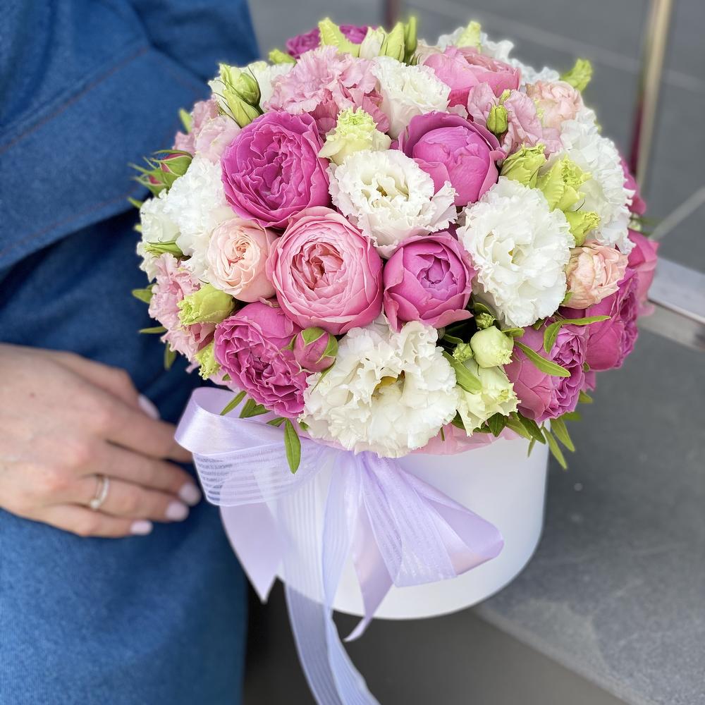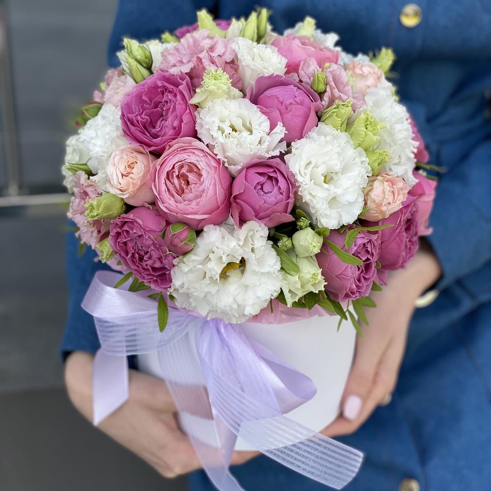 Коробка Сладкое послание из кустовой пионовидной розы и эустомы в Дмитриеве