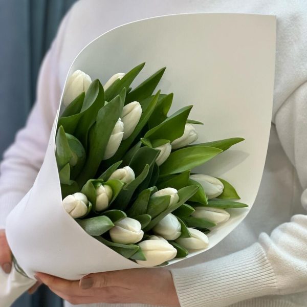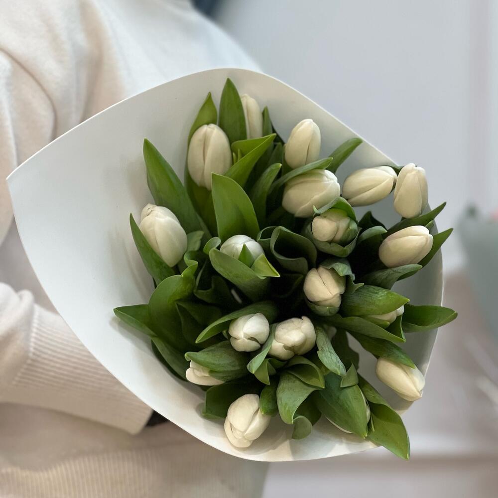 Букет белых тюльпанов (19 шт) в стильном оформлении «Весеннее настроение» в Дмитриеве