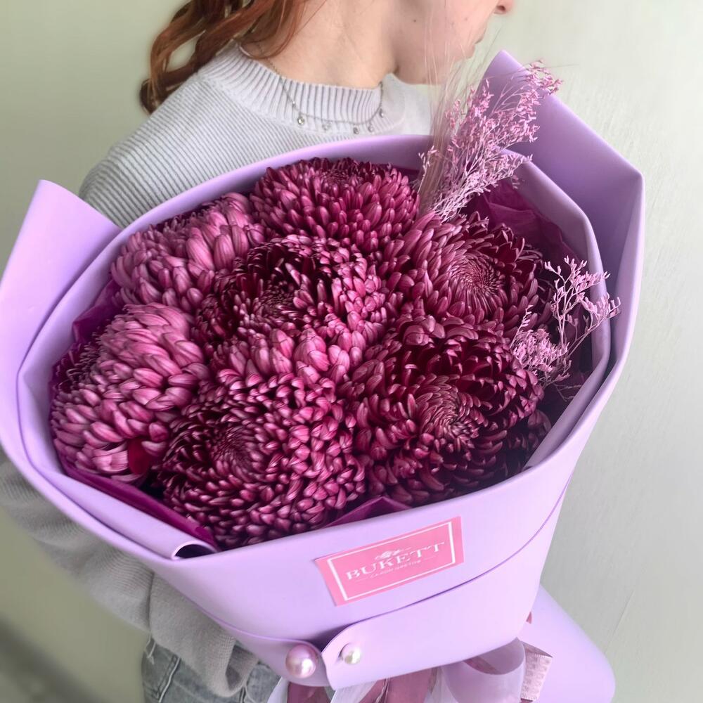 Авторский букет из великолепных хризантем винного цвета, порадует своего обладателя необычайной красотой,